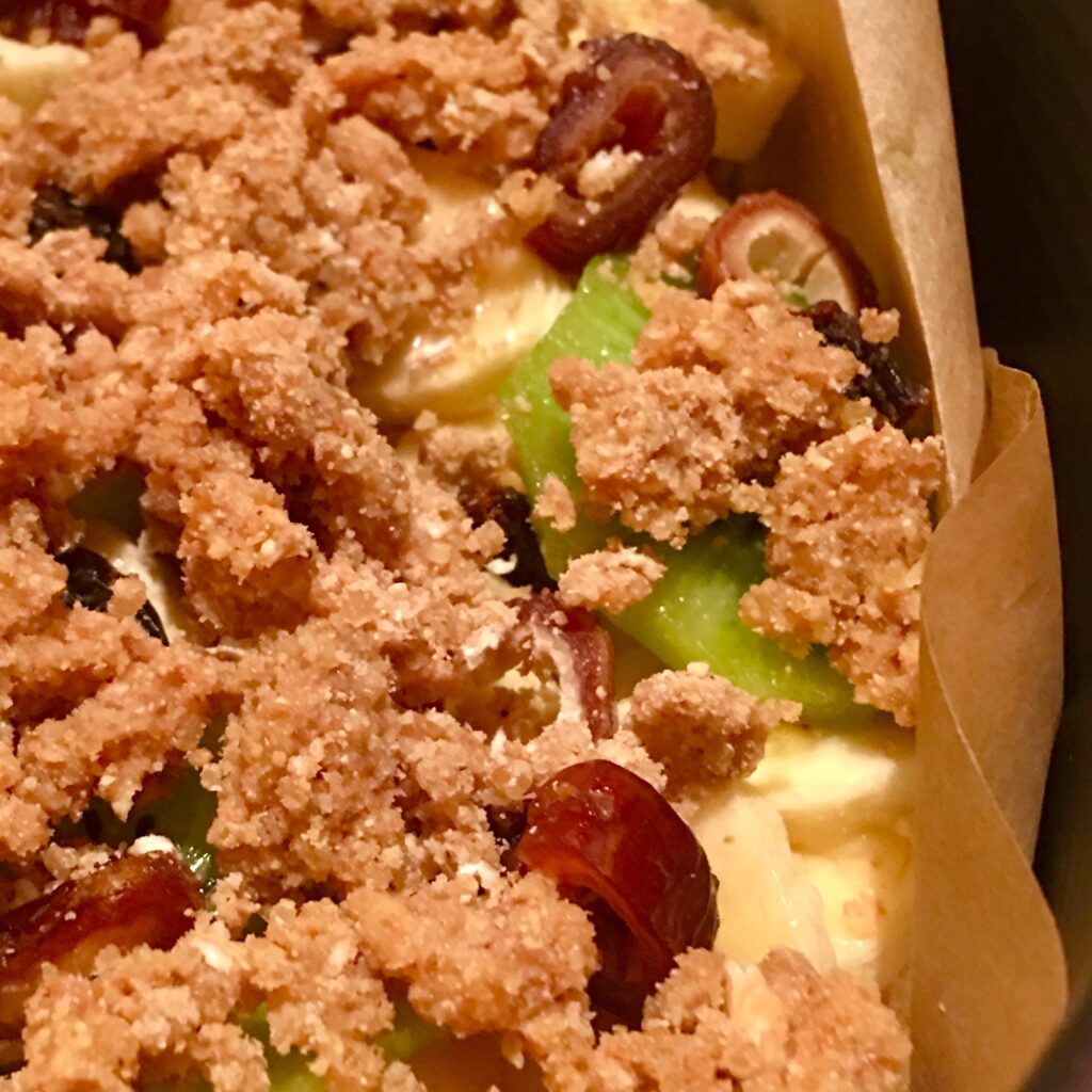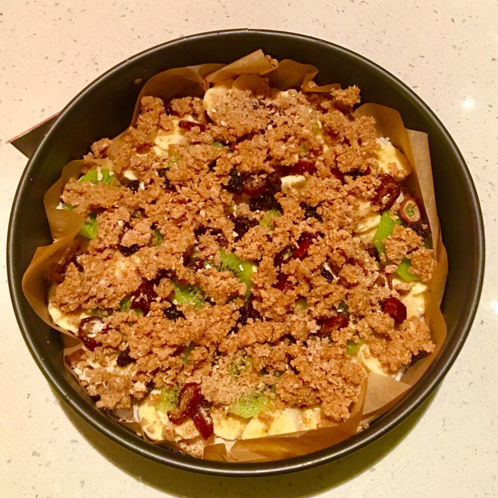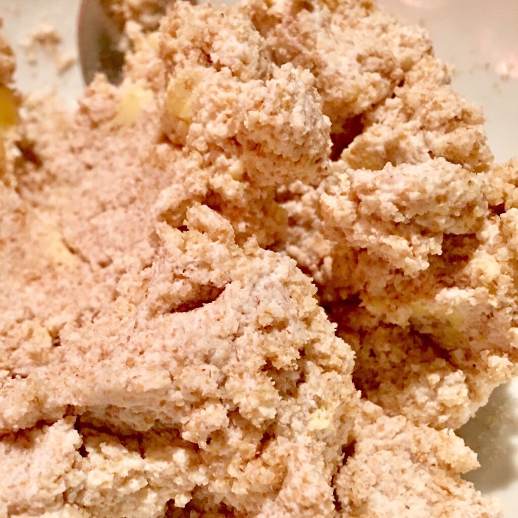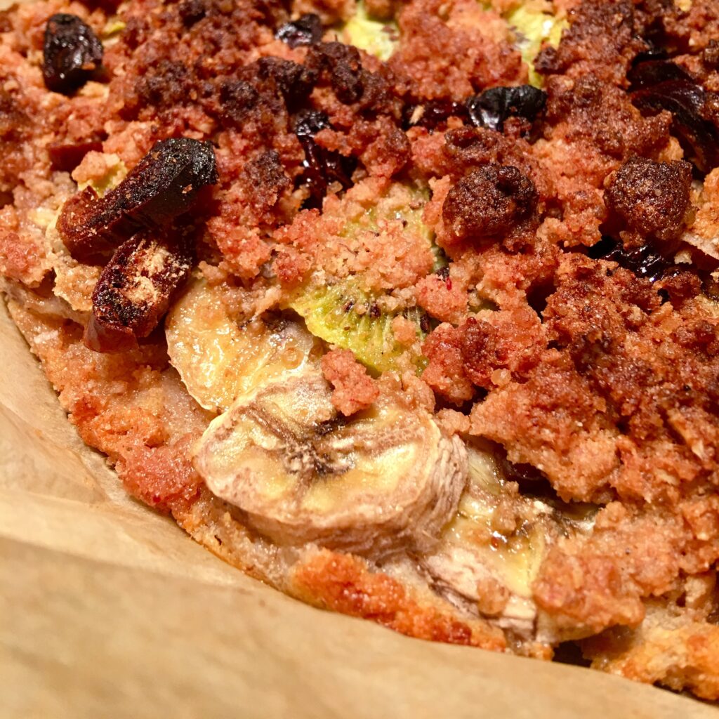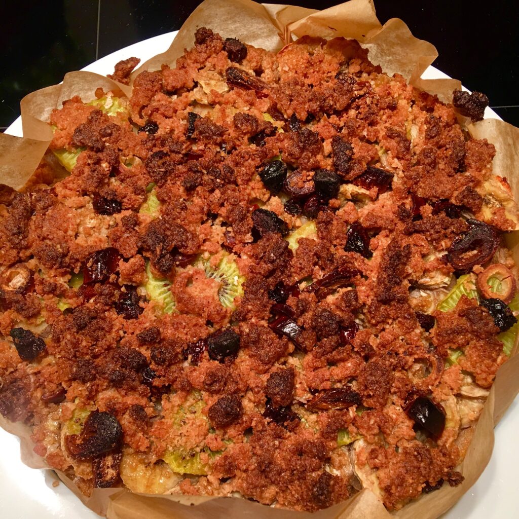 Najpierw rozejrzałam się co mam w kuchni i zaczęłam główkować, jak połączyć minimum składników, żeby wyszło coś pysznego. Mignął mi post na Instagramie z obrazkiem zapiekanki ze spodem z kaszki manny. W myśli pojawiła mi się kruszonka z placków na wsi i tak powstał pomysł na innowacyjną tartę.
